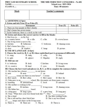 Đề thi giữa học kỳ 1 tiếng Anh lớp 6 2023-2024 Phúc Lợi – Hà Nội